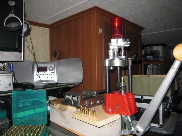 I have a Glass u shape desk and with a towel under the block, all I have to do is slide out of the way. Reloaded 100 rounds this week.