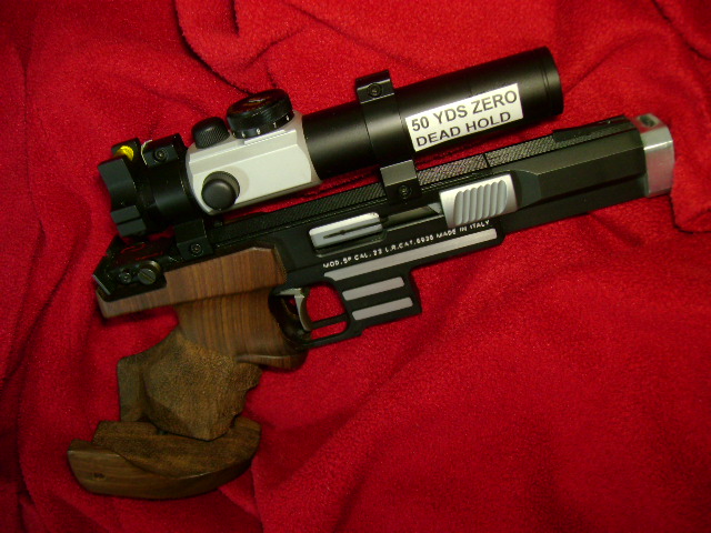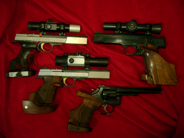 I am fortunate to own a Pardini SP22, an Olympic favorite. This one sports an Ultra Dot Match Dot and Germany's finest "RINK" upswept target grips. This model is recoiless thanks to the compensator. Larry Carter, of Camp Perry fame, beveled & tweaked the trigger. 50 yard performance with two hand hold yields a 96+3x, a real trophy getter. For a back up I have the Hammerli Trailsides, S&W M-17 & 41 and the venerable H-S Trophy.