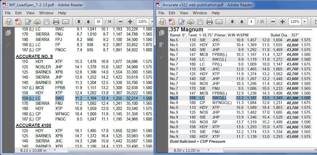 I downloaded the latest edition of Western Powders' load data manual (version 5.0, available here) and compared the data against a previous edition (version 3.2.2) of their manual that I had used just a few years ago to develop some .357 Magnum loads for my 6" Ruger GP100. The following image shows the pages from both manuals for .357 Magnum loads using Accurate No. 9 powder: