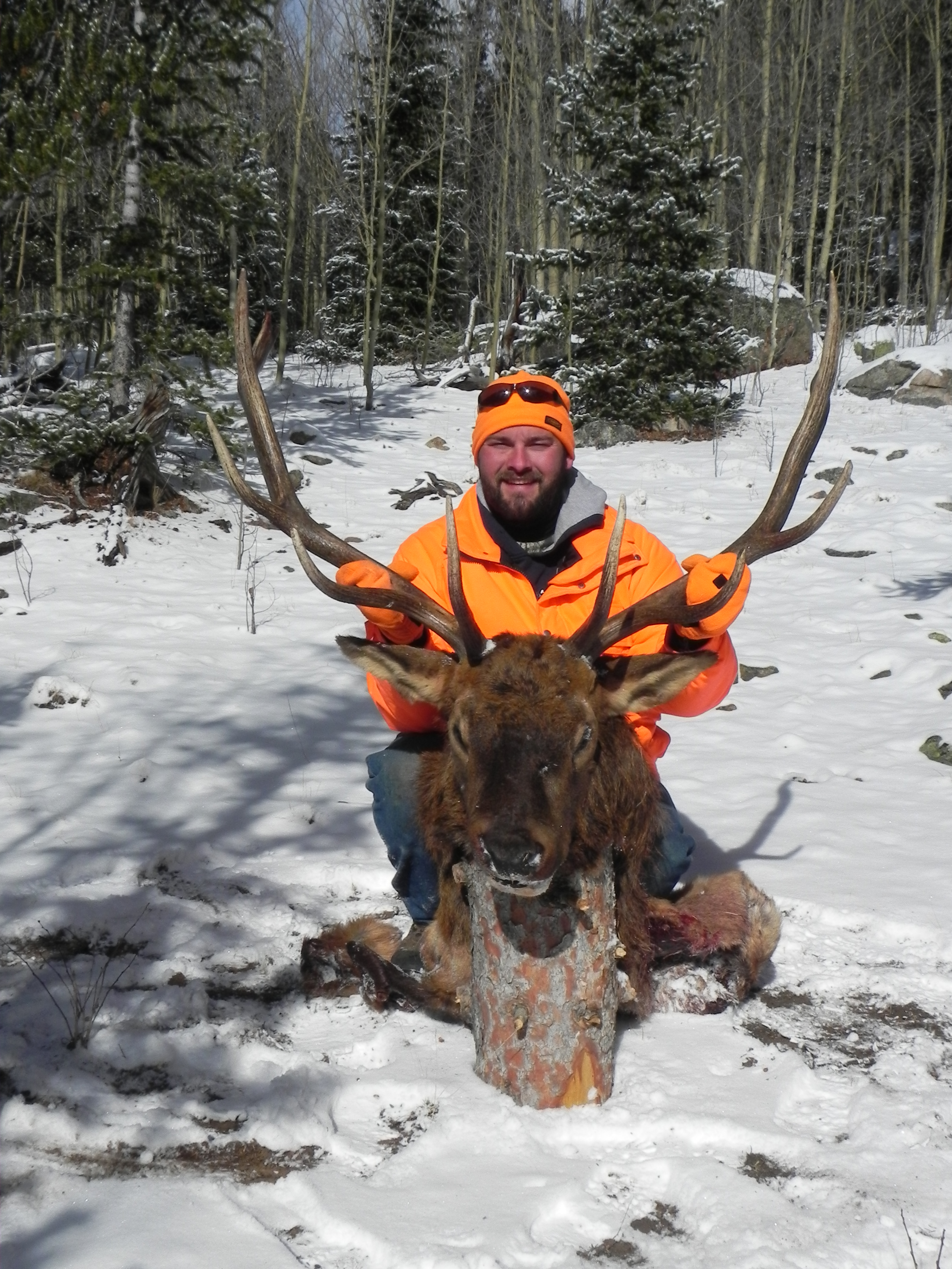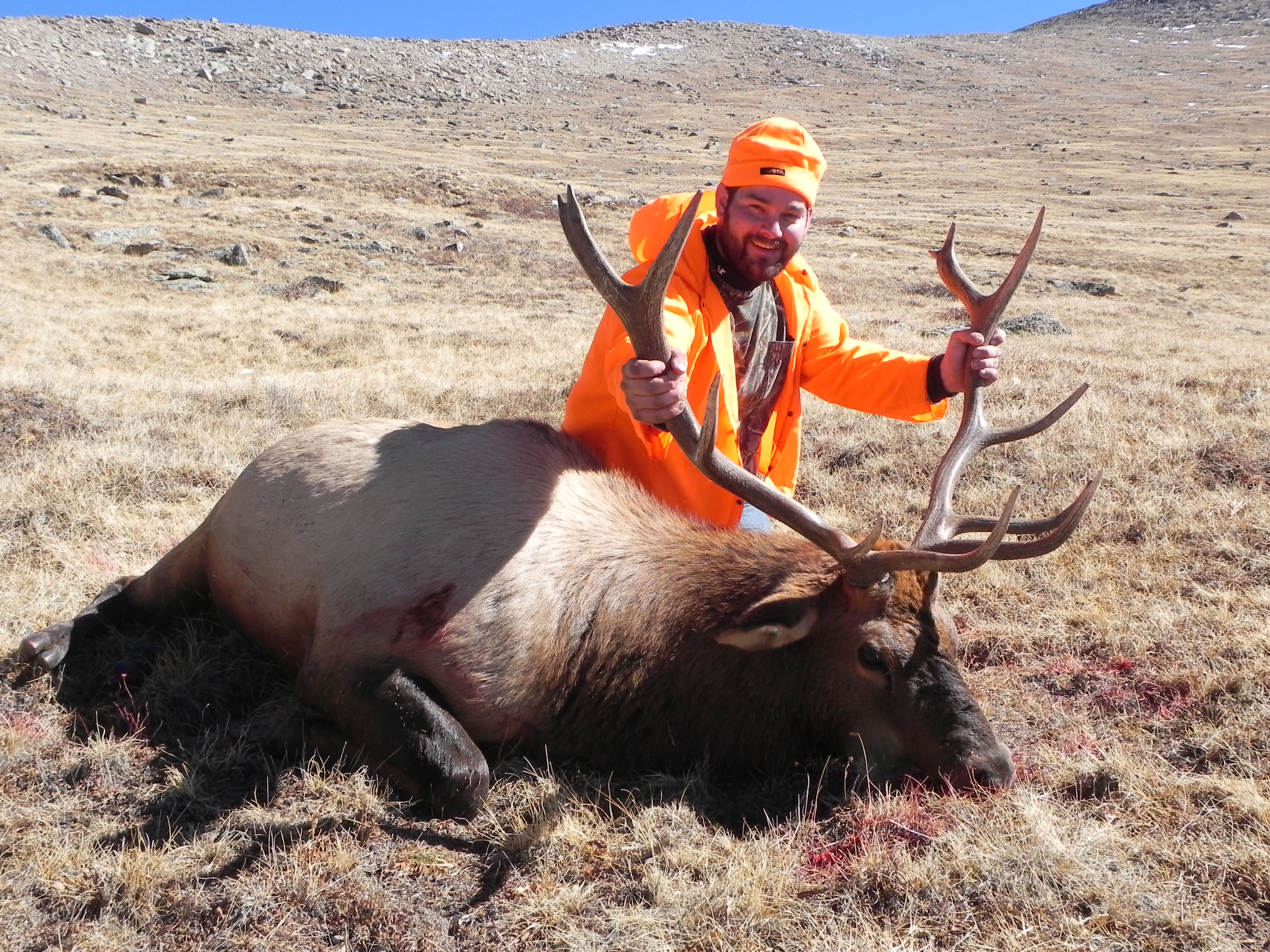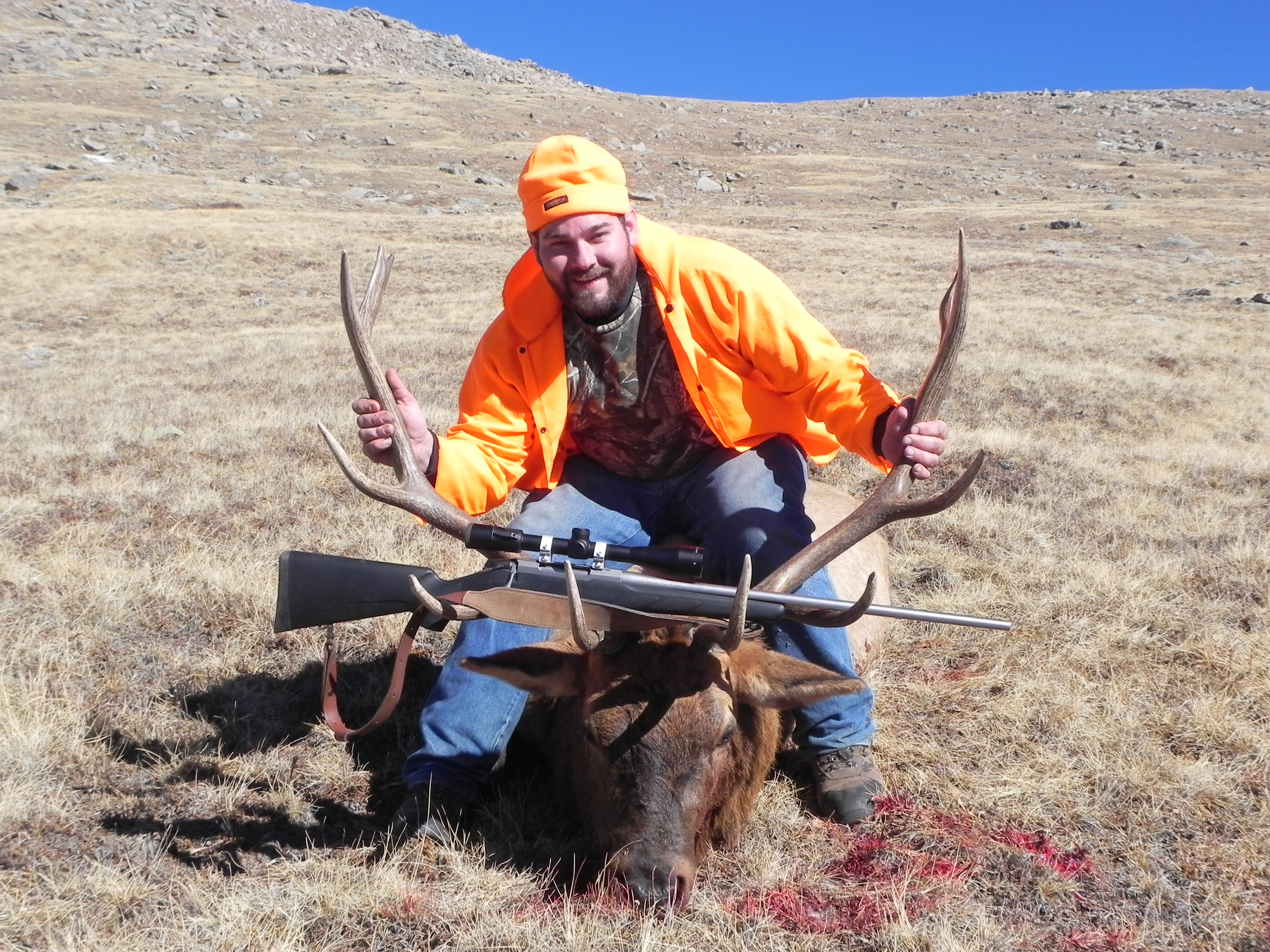 Congratulations. Nice looking bull. I had a somewhat similar situation this year. My third year elk hunting without a shot yet. Hunting NW of Denver about 60 miles. Last day of the season and I told my fellow hunters I wanted to get the neck meat from their kills. They gave me the lat/longs and when I found the carcass I was about to get my knife out when I spotted a bull about 50 yards from me strolling along. I was in a wooded area so he didn't see me and I shot at him. He paused briefly and then continued. I shot again and down he went on his face. As I worked my way over to him he began to push with his back legs. He plowed 135 yards before running out of steam and I shot him again through the head. I had a new Browning X bolt in 7mm-08. I was a little concerned that it would be enough gun so I loaded up some 150 grain Barnes solid copper bullets. First shot was through the lungs with a 2" exit. Second shot went through both shoulders, broke them both and kept on going. No more worries about that caliber using that bullet. Then the work started