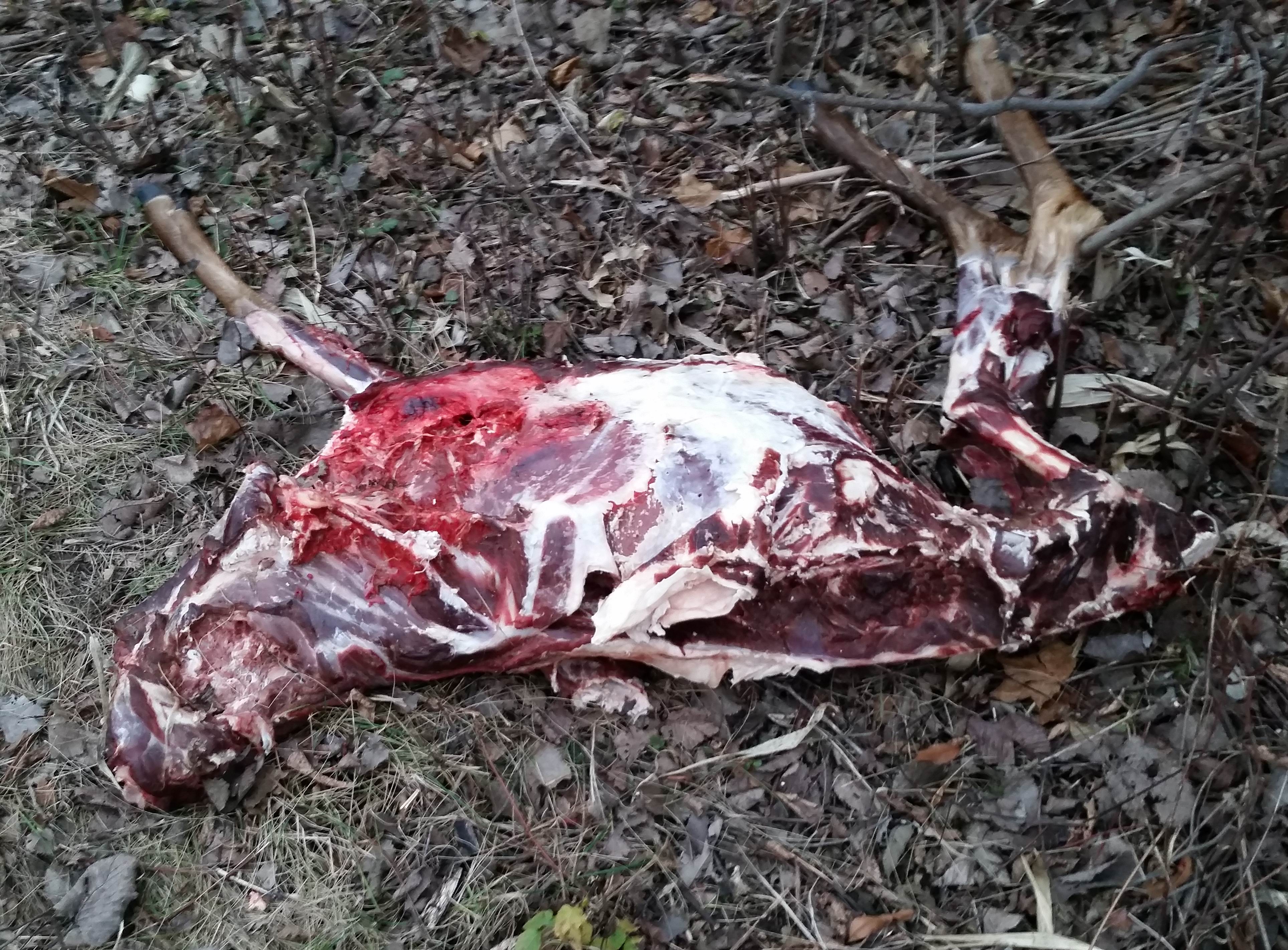 I was up north and did not discover the carcass until Thursday, that is when I took the picture. There were a half dozen crows picking at it when I first found it and my neighbor said he saw it Sunday morning, 4 days before I found it. So how much meat was removed by the crows before I found it? When I took the picture, I never looked that close to see if maybe a coyote had removed some of the meat. Now it is basically a skeleton, most all of the meat has been eaten by scavengers. It was easy to see that the blackstrap were cut out, appears to be the same for the roasts from the rear quarters.