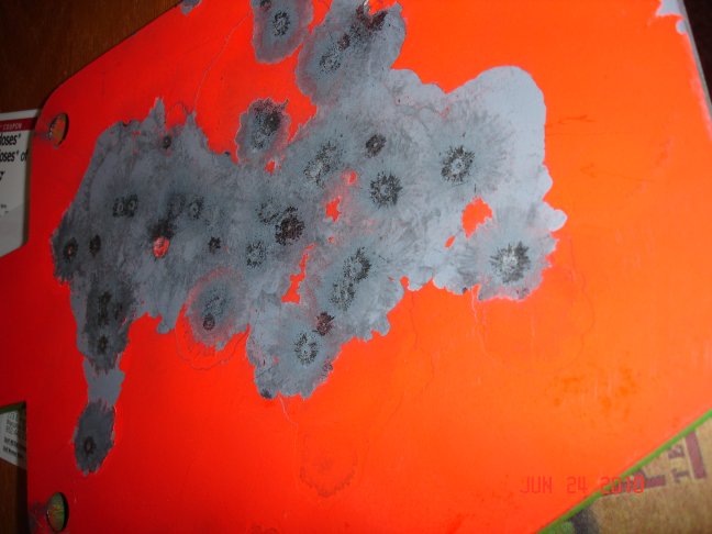 The orange side has had over 600 rounds from 22 to 45 in pistol and rifle 22, 17HMR, lots of 5.56 and one 270 YUP look close that one left a mark about at the heart.