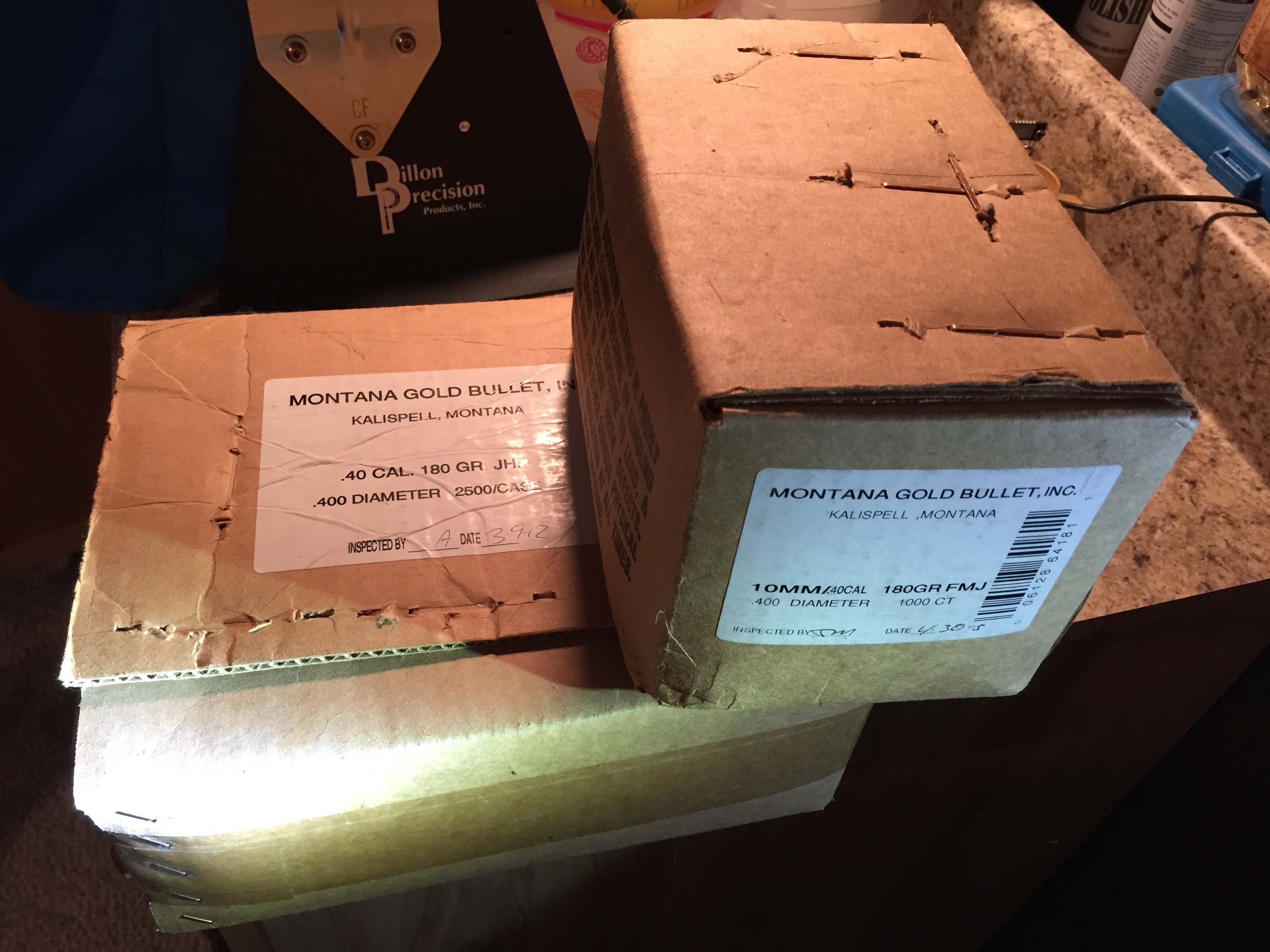 Partial case of Montana Gold Bullet 180 grain JHP. Estimate I have about 1/3 the 2,500 bullet case remaining. New price: $355 (for full case)