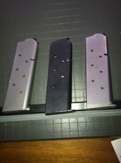 I'm no longer in the single stack 1911 game. I have three Colt mags(1@7-2@8 rounders) all with correct marking, font and 'prancing pony'. One matte stainless, polished stainless and one blue finish. All are like new with only faint marks on the one. Pics are poor quality will repost proper pics on request. SPF Thanks-J