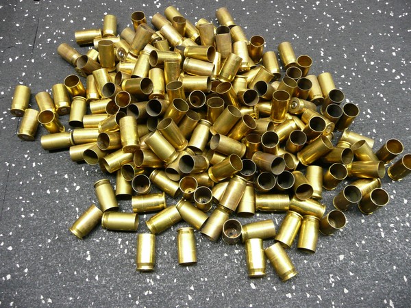 600 pieces of once fired .45ACP brass, various headstamps. Brass and Nickel cases. Photo shows a random selection of the brass.