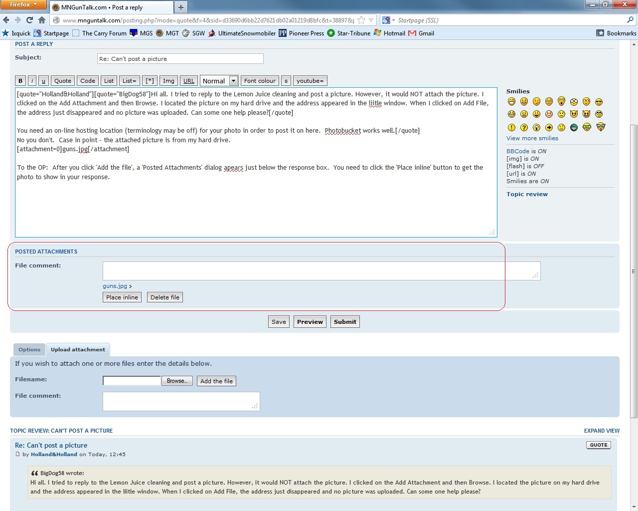Holland&Holland wrote:BigDog58 wrote:Hi all. I tried to reply to the Lemon Juice cleaning and post a picture. However, it would NOT attach the picture. I clicked on the Add Attachment and then Browse. I located the picture on my hard drive and the address appeared in the liitle window. When I clicked on Add File, the address just disappeared and no picture was uploaded. Can some one help please?