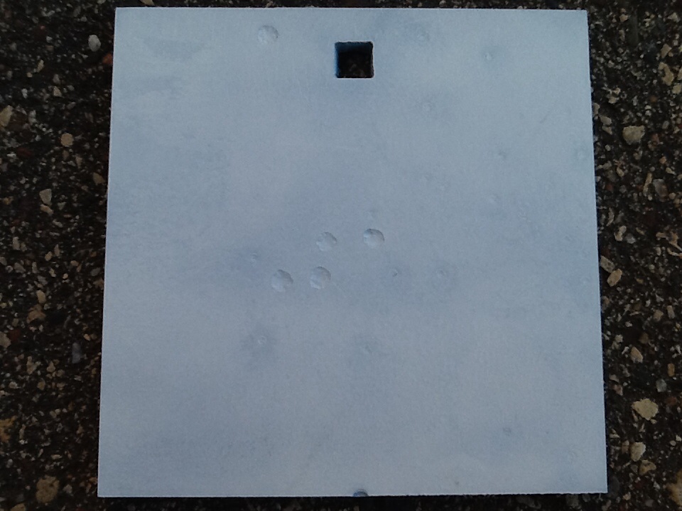 I picked one 8" square target, hung it at an angle from a stand using a 1/2" bolt, and shot it with my .308 and .223 at 100 yards. I wanted to do a harder test on it even though I should probably be shooting at 150 yards. After shooting, I ground off the face with a wire wheel grinder and painted it again so I could see the damage more clearly.