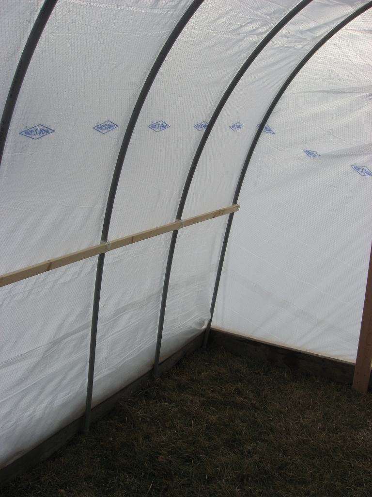 I drove rebar stakes in the ground to anchor the ends of the PVC conduit hoops, threw together the end walls, tied it all together with duct tape, and stretched plastic over it. I probably have $60 in it.