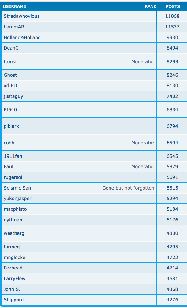 Seismic Sam, Rugersol, and 1911fan (perhaps others), have left the range. Many of the rest just quit working on their post count.