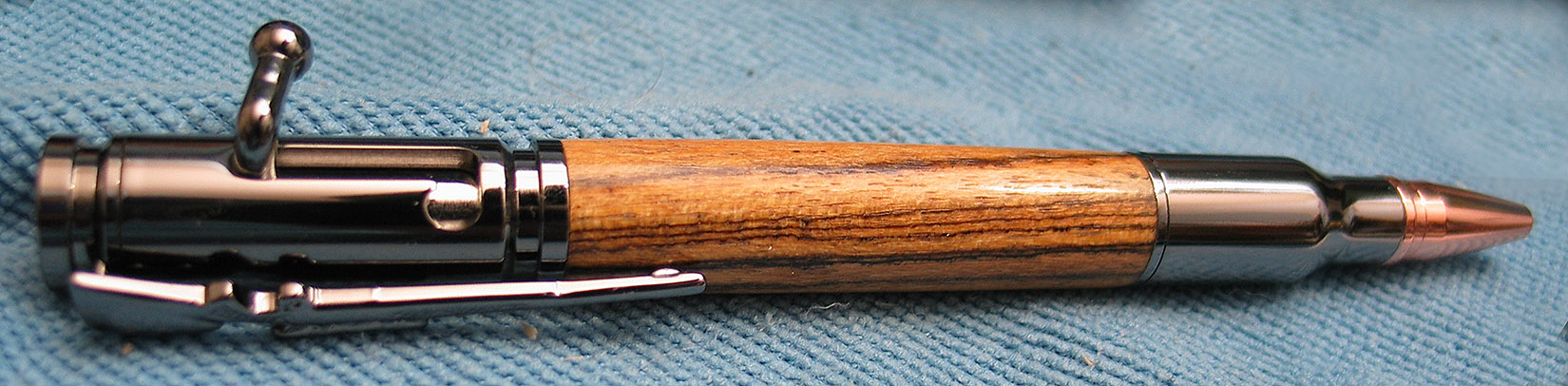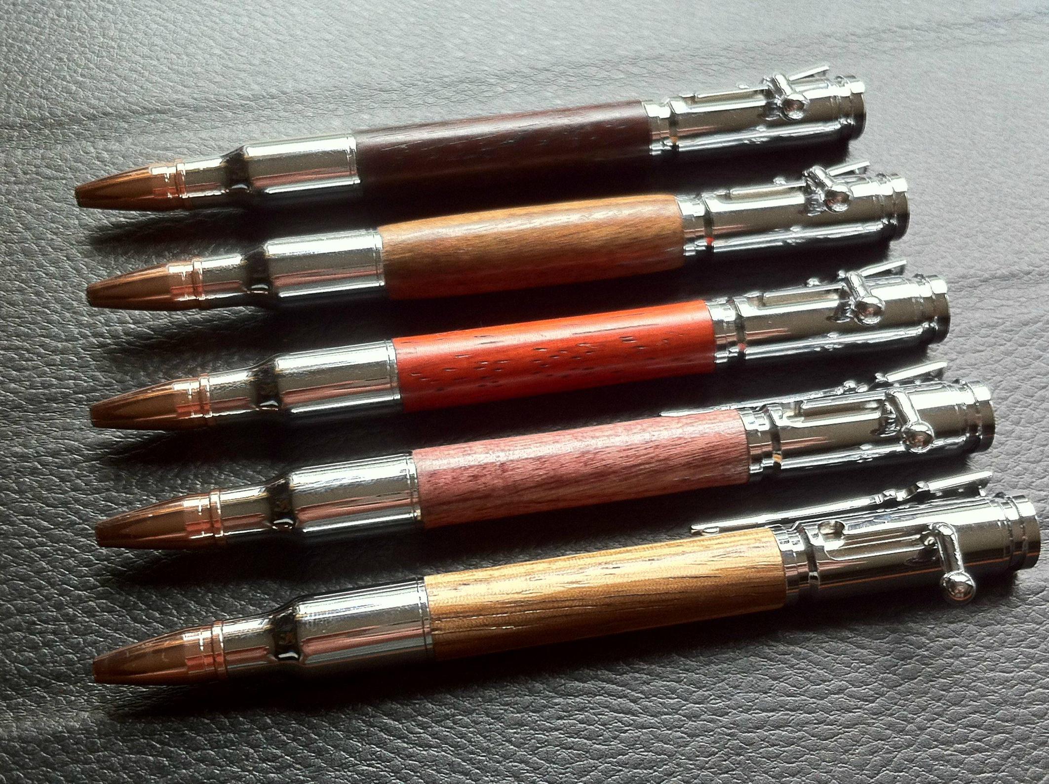 Behold the completely original and irresistibly fun .30 caliber Bolt Action pen. This pen is the perfect gift for any gun enthusiast. The realistic bolt-action handle smoothly advances and retracts to securely lock the refill in place. Includes a bolt action rifle clip and a replica 30 caliber cartridge and rose gold bullet tip for added authenticity.