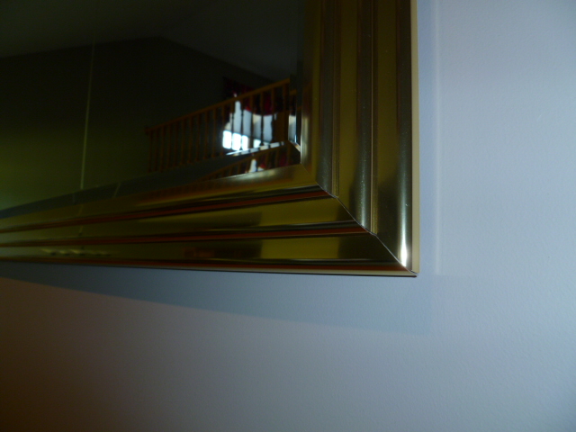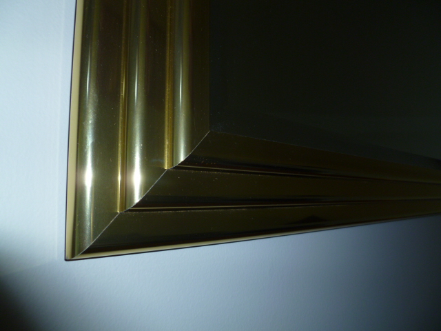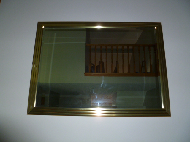Mirrow has a anodized aluminum frame with a brass finsh and measures 33 x 45. This is a quality, Carolina brand mirror that we paid over $300- for.