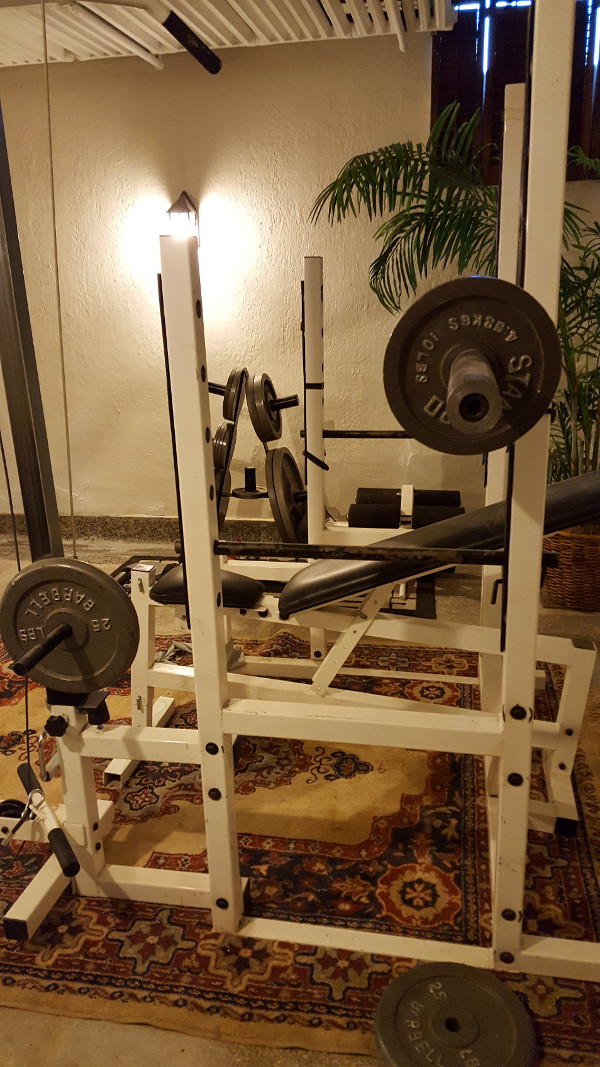Home Gym - Multipurpose free standing free weight workout center. Perfect for bench press, seated military press, squats, triceps and trapeziums pull down, rowing, curls. Has two attachments for bench bicep curls and leg extension/curls. It all disassembles for relocation and transport. Footprint is 48 x 48 x 68.