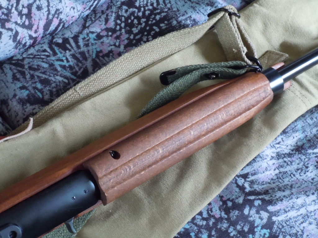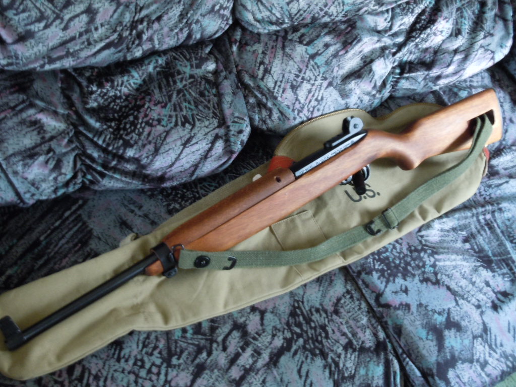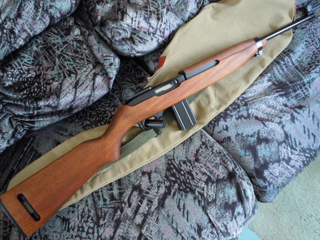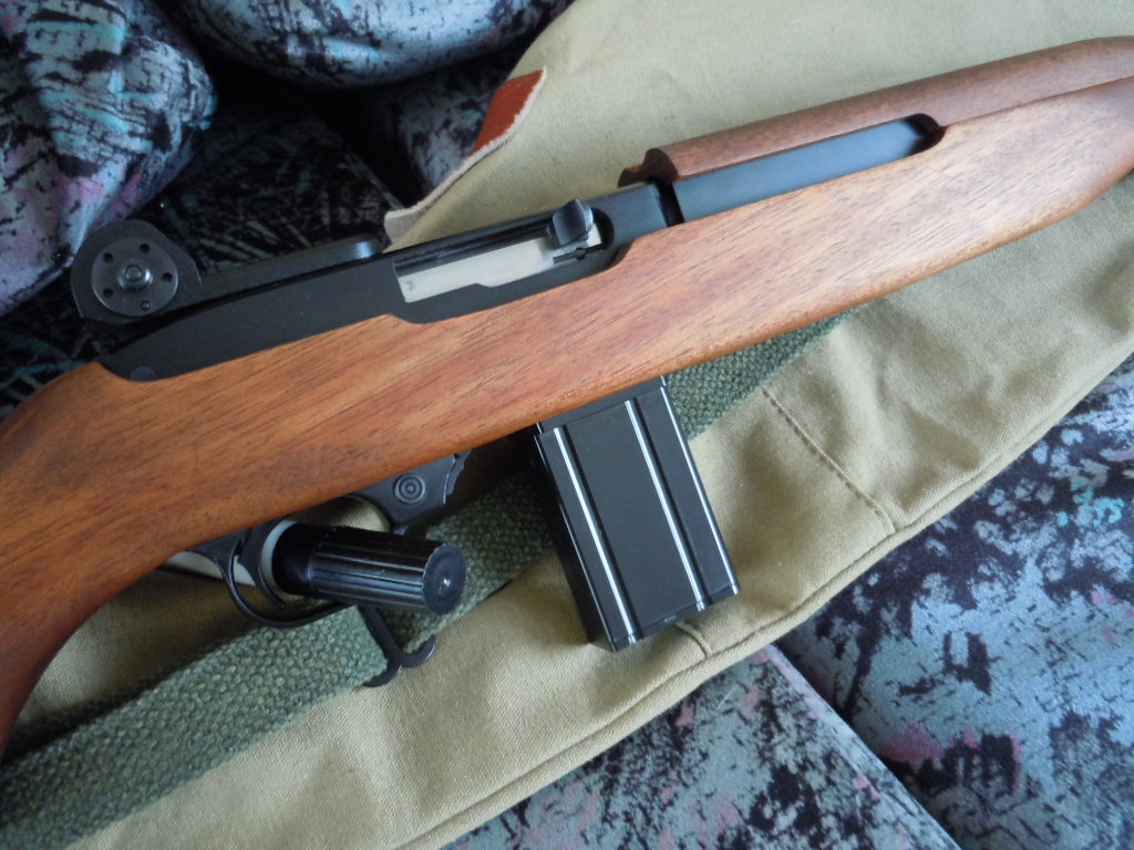 I put it in a replica M1 carbine stock set. I have been wanting to do this for a long time. The stock set/sling/oiler originally came from Sarco, and the rest (Tech 200 sights, uncut handguard, magazine extensions) came from E. Arthur Brown in Alexandria. Replica case came from Numrich.