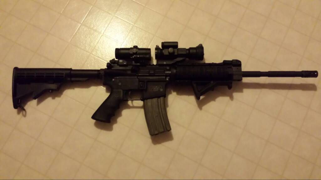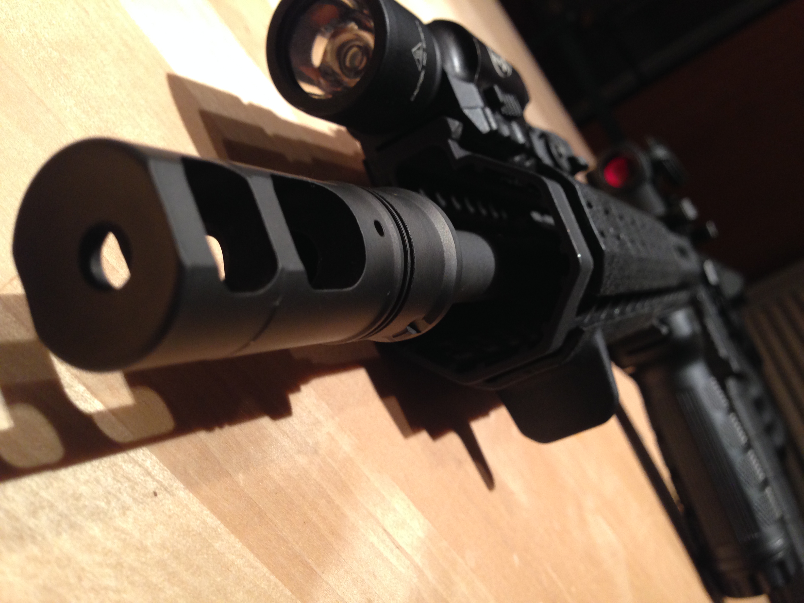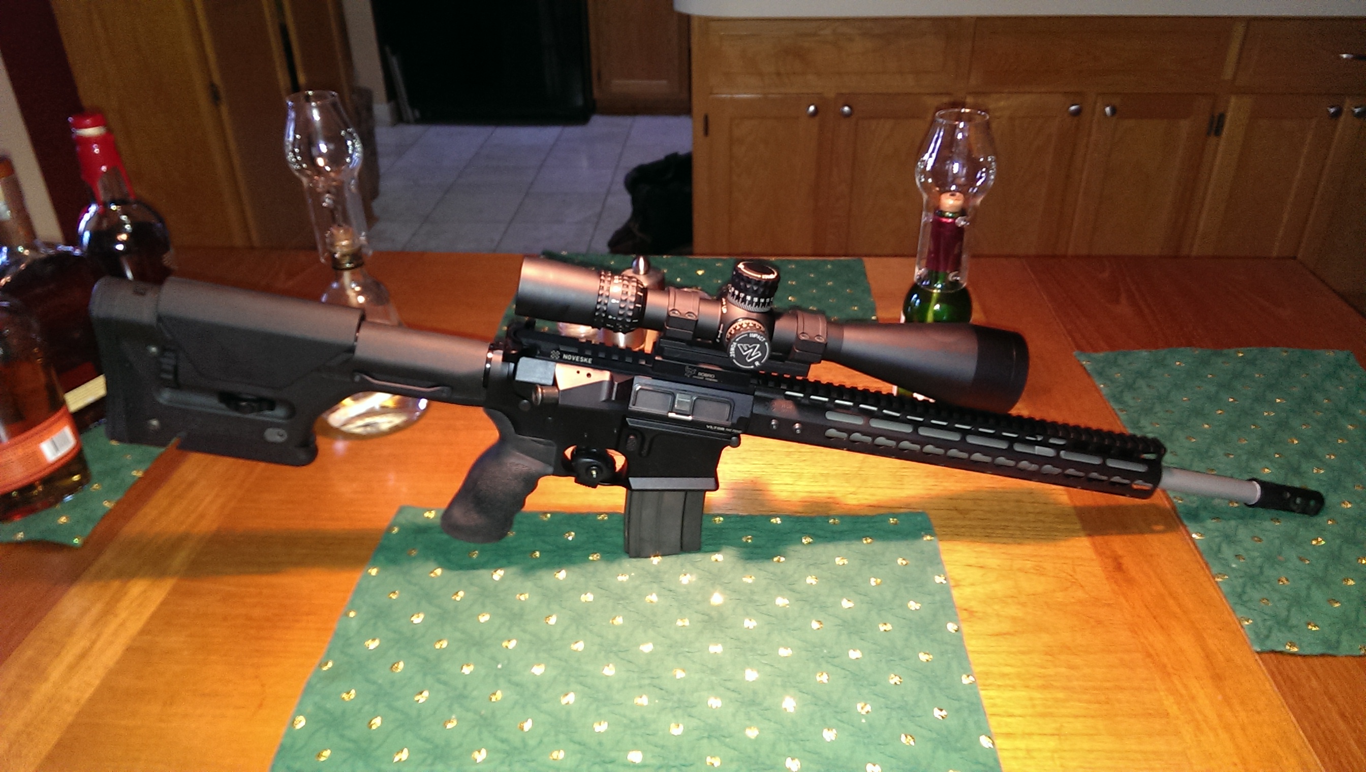 It consists of: Palmetto blemish lower, Noveske upper (not chainsaw) a CMMG parts kit, Troy 15" Alpha Rail, Daniel Defense 14.5" middy barrel with a government profile that is wearing a pinned Troy Claymore **front towards enemy**, a PRI fixed front sight, MaTech rear sight, PWS billet one-piece extension and a Magpul stock. The black MOE stock has been replaced in tabor of an FDE CTR stock.