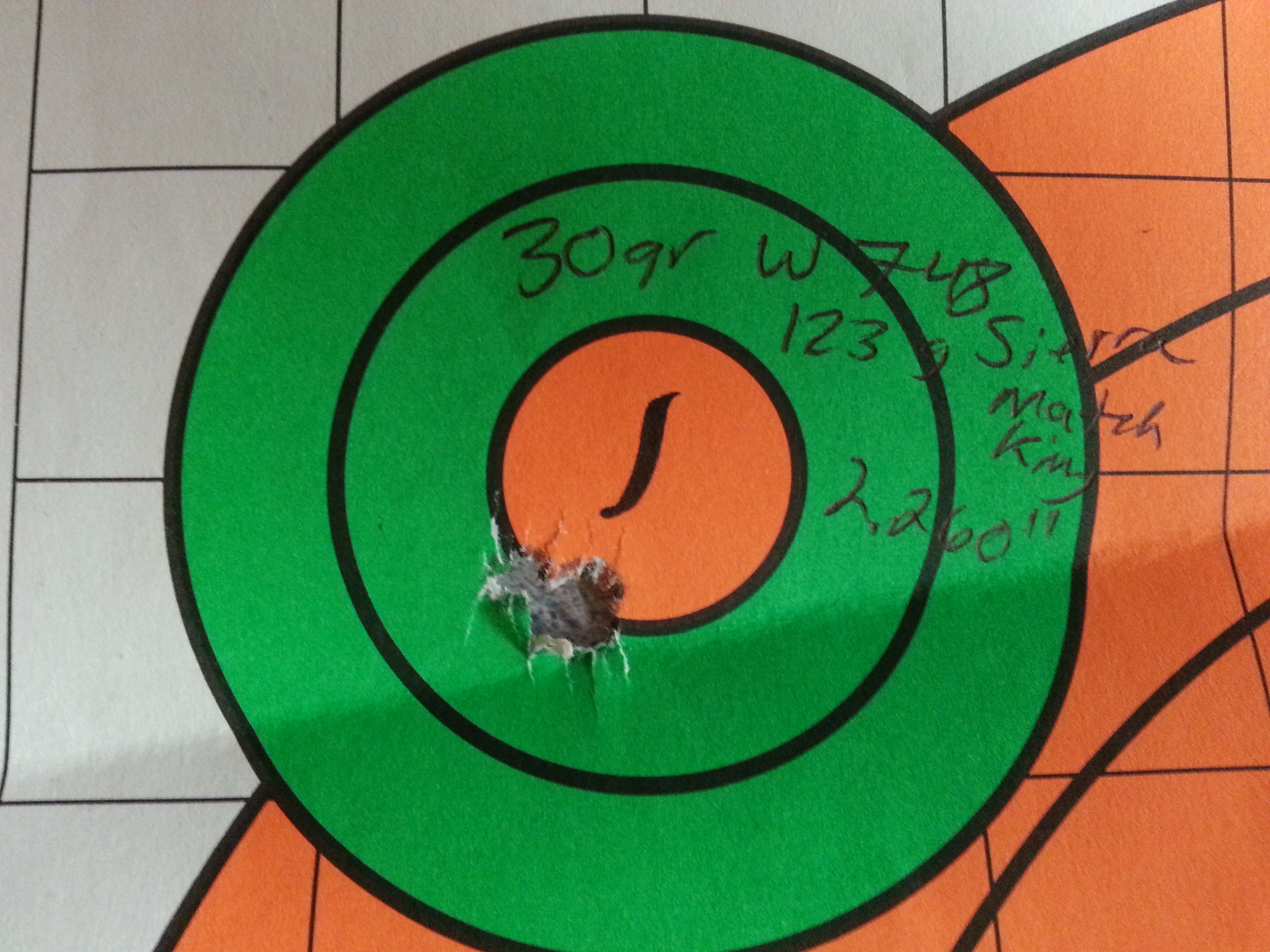 That's 30g Winchester 748, 123g Sierra Matchking, loaded to 2.260" OAL. The picture of the gun is from before I put a Vortex Viper PST 4-16 FFP on it. The picture of the target is from after the Vortex was installed.