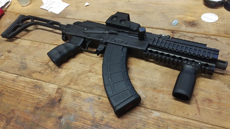 Front rail system is a heavily modified UTG M70 Yugo rail. It utilizes the factory "hotdog bun" mounting point as well as the barrel/gastube clamp. The front sight was cut off and reshaped to clear the rail.