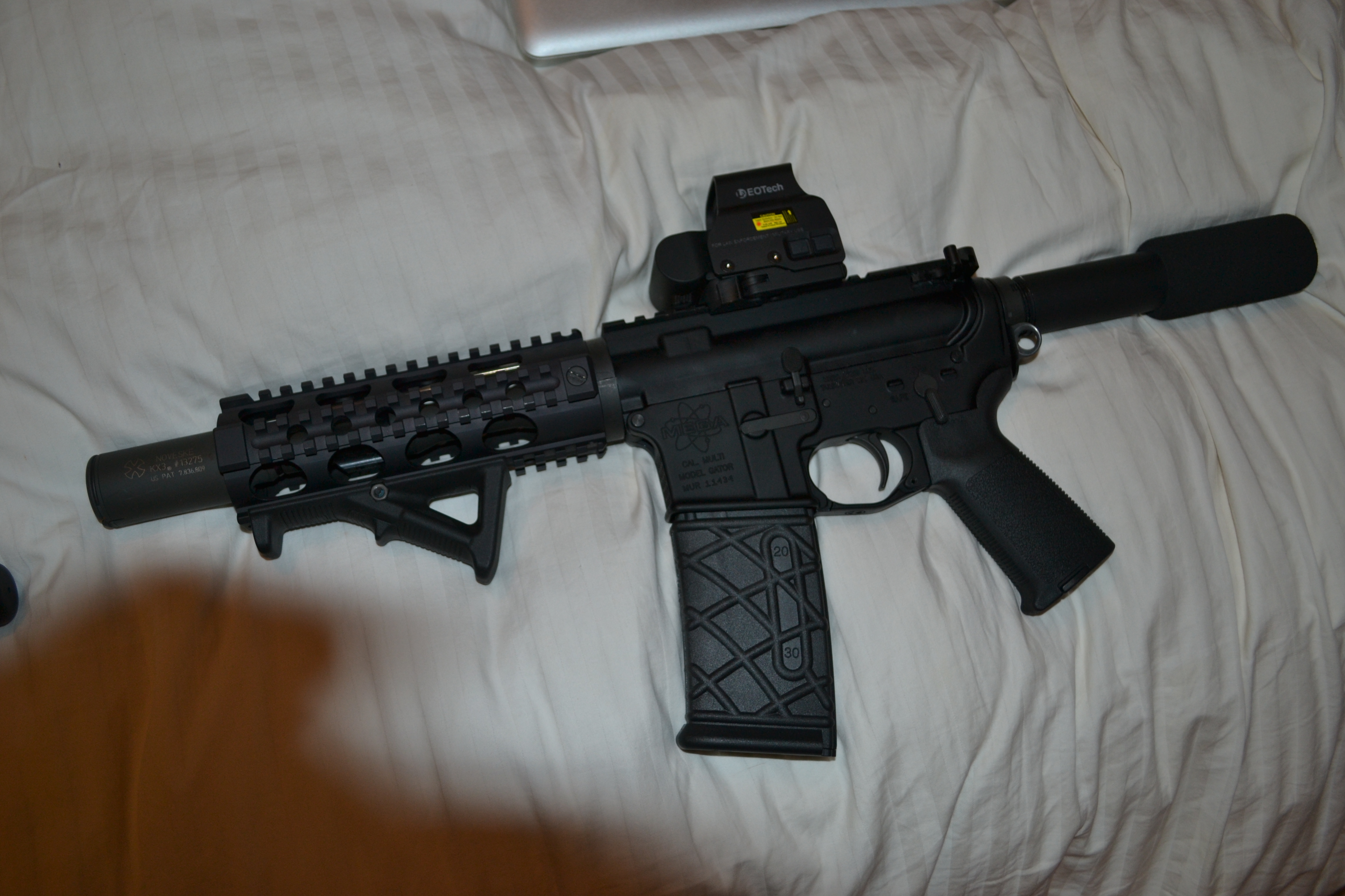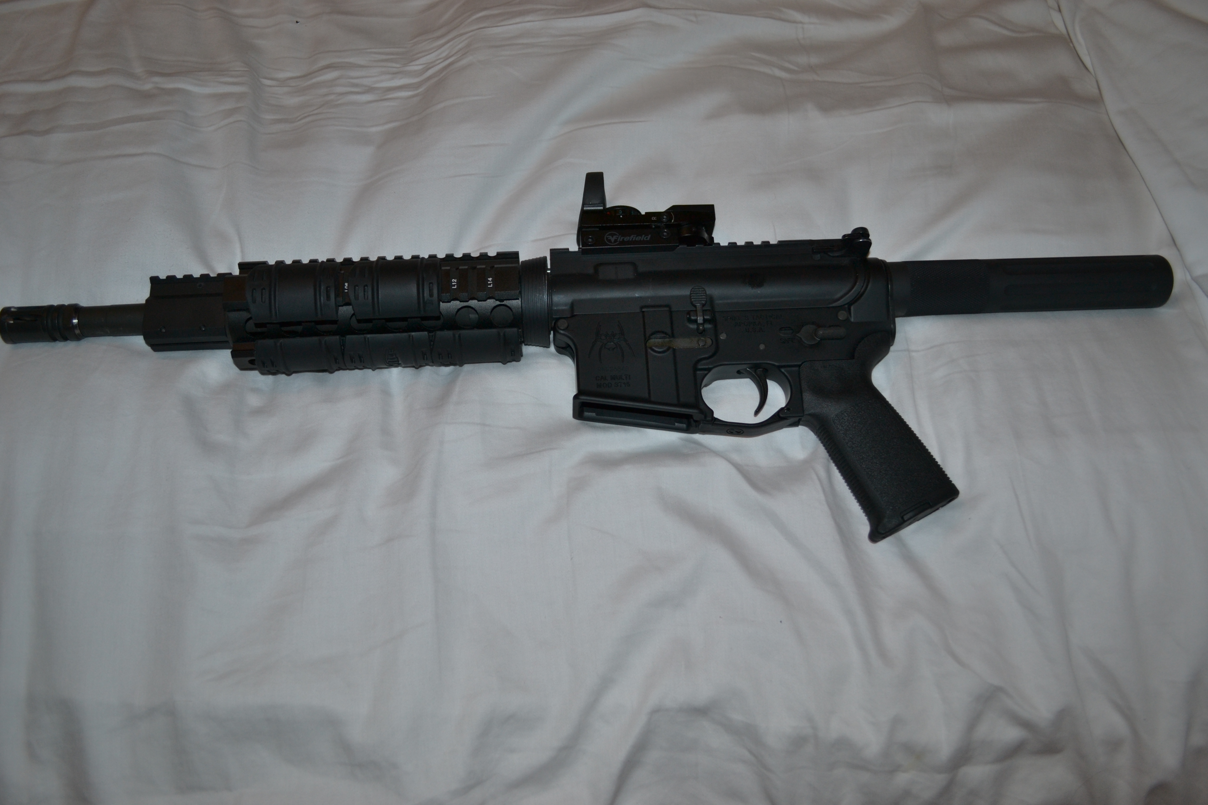 I'm looking for something with like a 6-8" barrel, but with a railed handguard that covers the entire barrel and flash hider/ comp.
