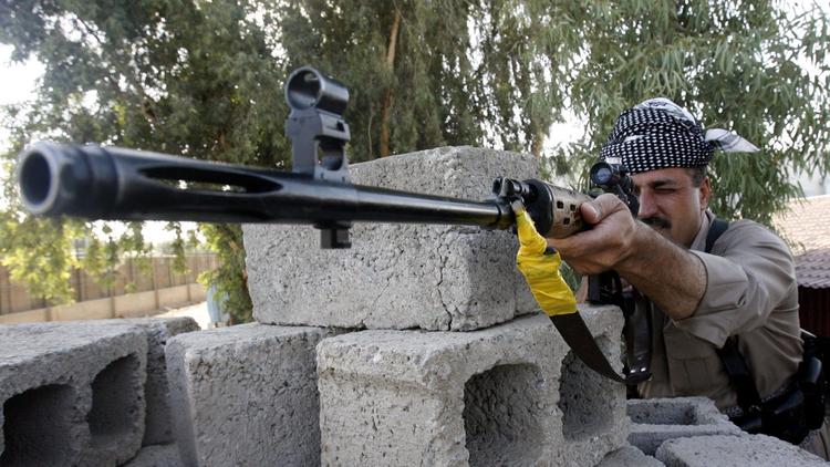 "A former member of the Kurdish peshmerga who volunteered again to fight against militants from the Islamic State takes up a position near Mosul, in northern Iraq."