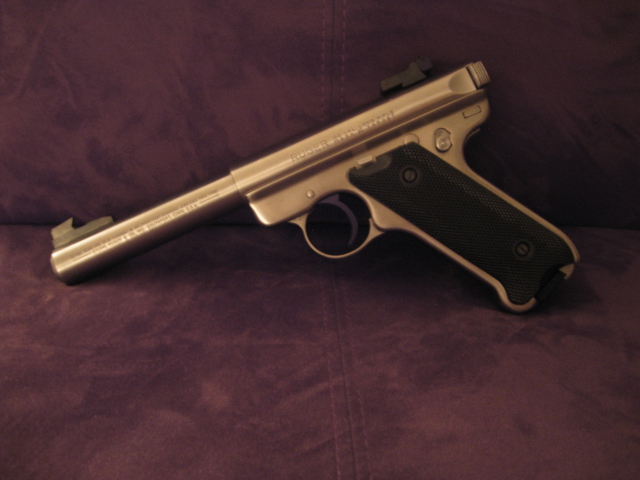 A new-to-me (used) Ruger Mark ii Target in stainless with a 5.5" barell. I had to stop at Lowes today in Rogers and Cabelas is just down the road from there. Turns out if you go in the middle of the day during the week so actually get great service! I felt like I was the only guy in the store. They gladly took my $269.