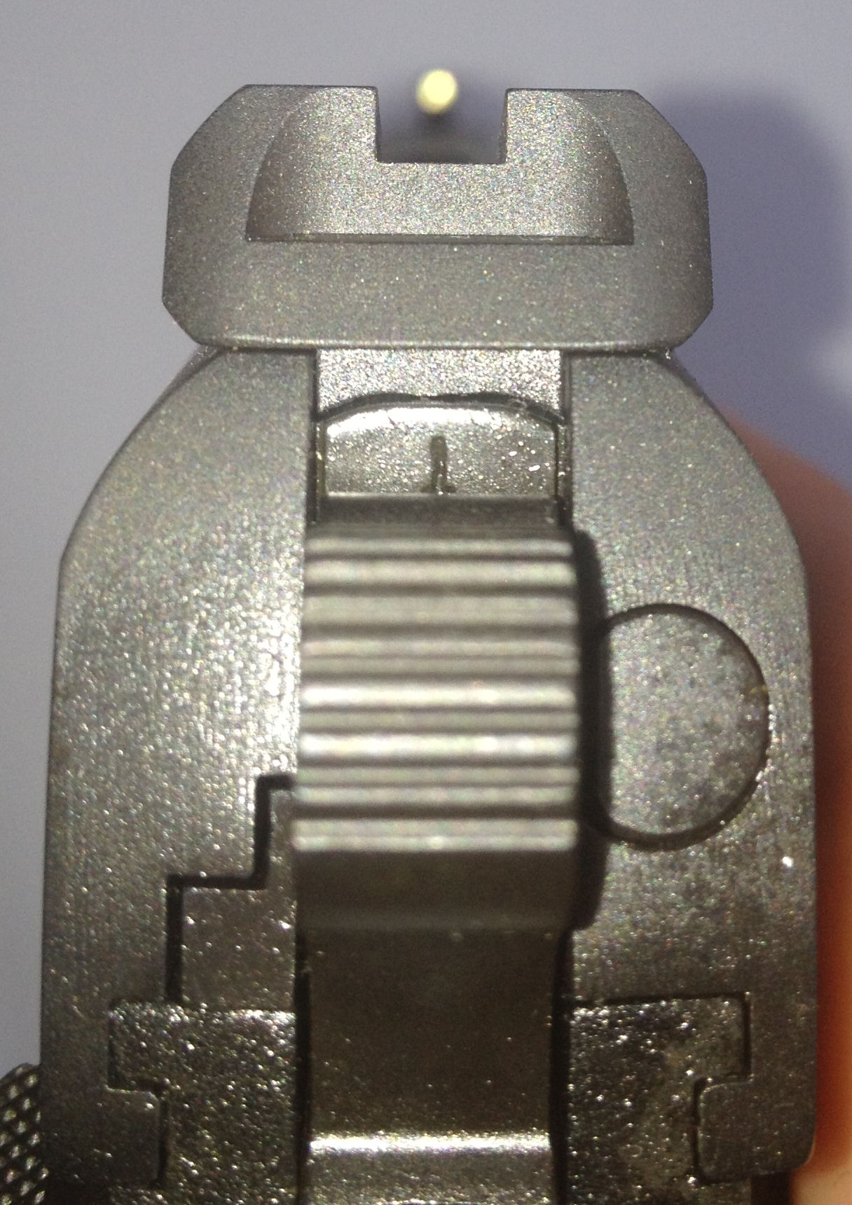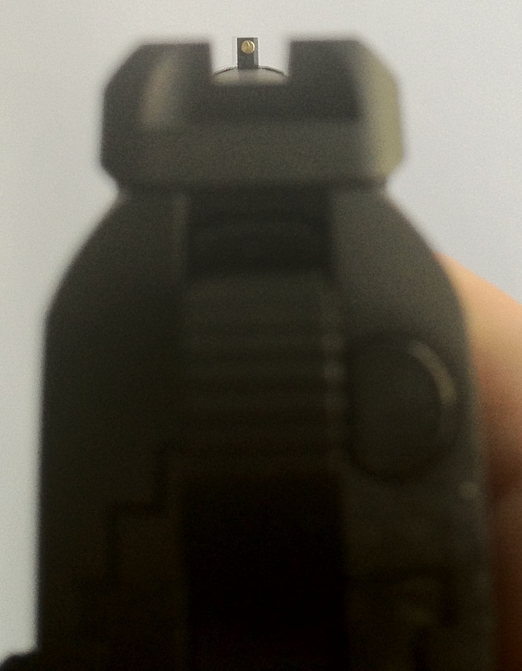 As I said, I find it really easy to quickly acquire the brass bead on the front sight and I love the "gap" between rear sight posts and front sight post. YMMV, but it feels really natural for me, especially shooting with both eyes open. I should note that I am right handed and cross-eye dominant.