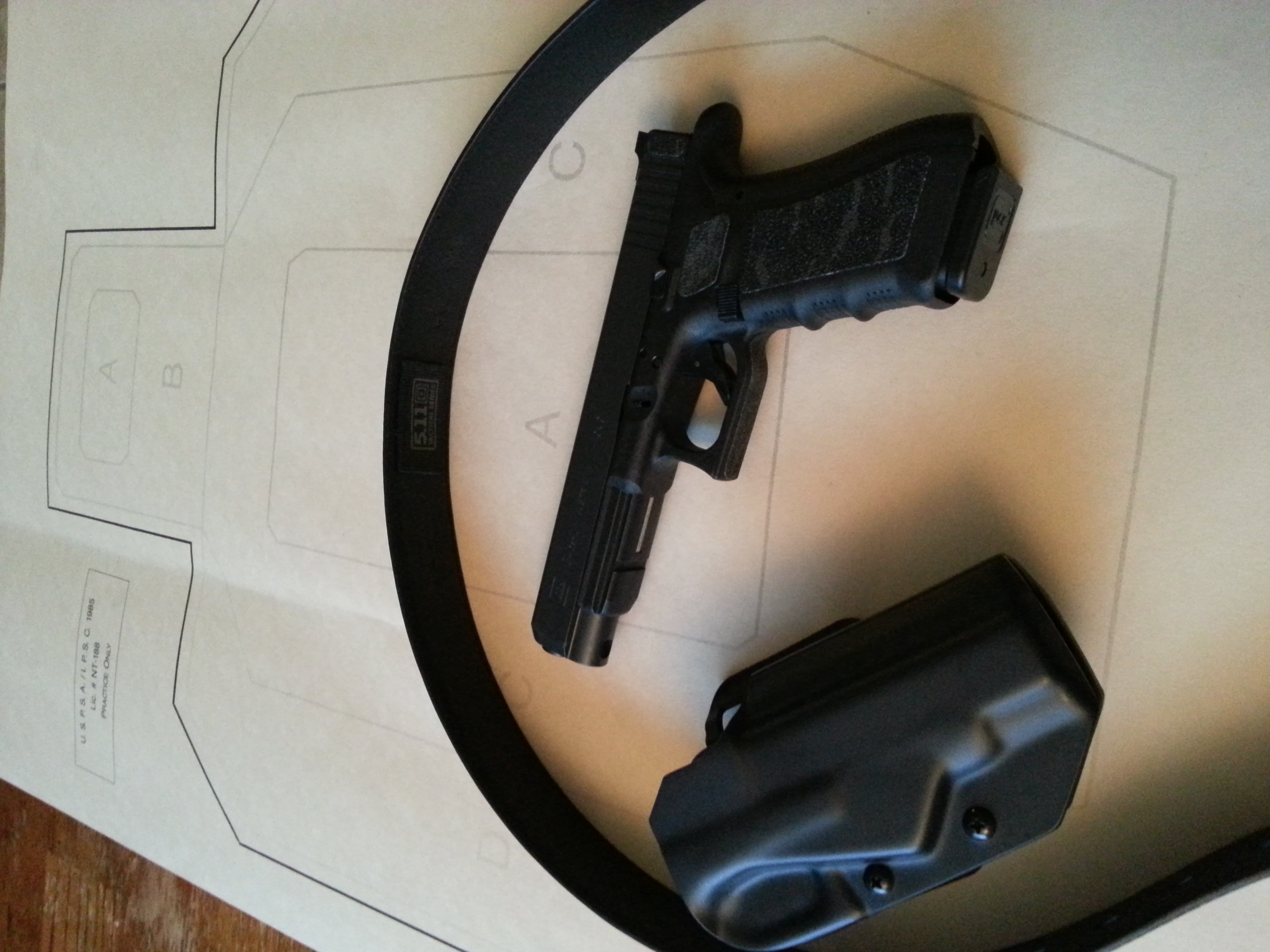 Thanks again for all the advice everyone gave me......updated picks of gun after upgrades. Picked up a BladeTech Black Ice OWB holster, Warren Tactical Sevigny sights, a 5.11 belt (I needed a new belt anyway) and some grip tape so far. (also about 2000 rounds of ammo to get me started) Next investment is either going to be the Vogel trigger or some form of a trigger job and mag pouches.