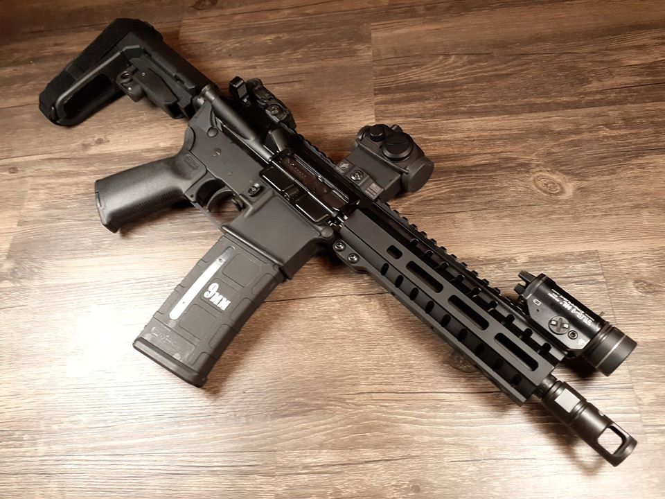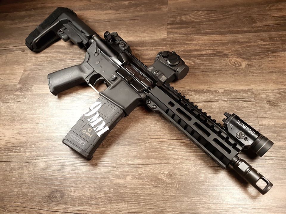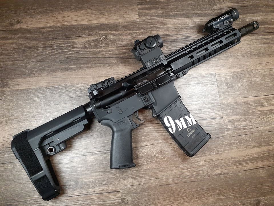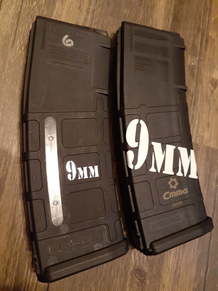 I have it set up with a SBA3 brace, Raptor charging handle, MOE+ pistol grip, Ruger Elite 452 trigger, Bad Lever, Magpul back up sights, front and rear QD sling points, and a TLR1 HL light with a front sight post on it. Right now I have a Primary Arms AMD red dot, but have a Holosun HS515GM on back order. To keep the 9mm mags identified, I'm going to cut out a vinyl stencil and spray paint them white with "9mm" but I'm not sure if I'm going to go with a large or small font... which one do you guys like better?
