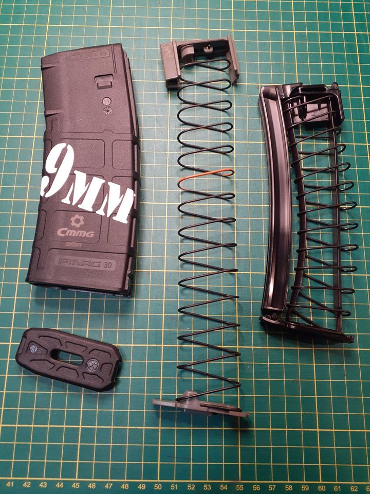 If you didn't know, the ARC stands for AR Conversion and allows you to take a standard gen 2 or 3 Pmag, pull out the spring and follower, and replace it with CMMG's ARC kit. It's done with no tools, and no permanent changes to the magazine so it can be swapped back to 5.56 at any time. It puts the 9mm round to the back of the magazine and basically adds another "feed ramp" in front of it to take up the extra space. Last round bolt hold open works perfectly! Here you can see the Pmag empty body on the left with the floorplate under it, the standard 5.56 Pmag spring in the middle, and CMMG's ARC 9mm kit on the right.