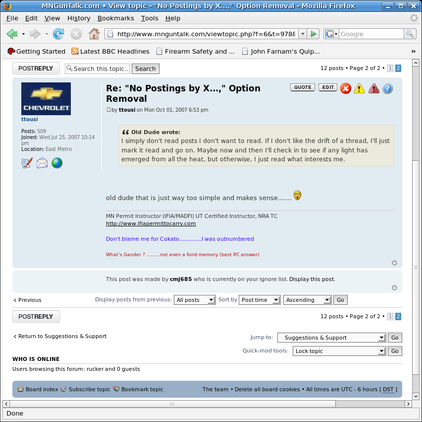 1911fan wrote:Allow me to ask this, are you asking for an Ignore "X" button, say under the avatar of the poster? As in those who do not want to read my posts would be able to simply click "ignore 1911fan" and I would not show up in your new post queries?