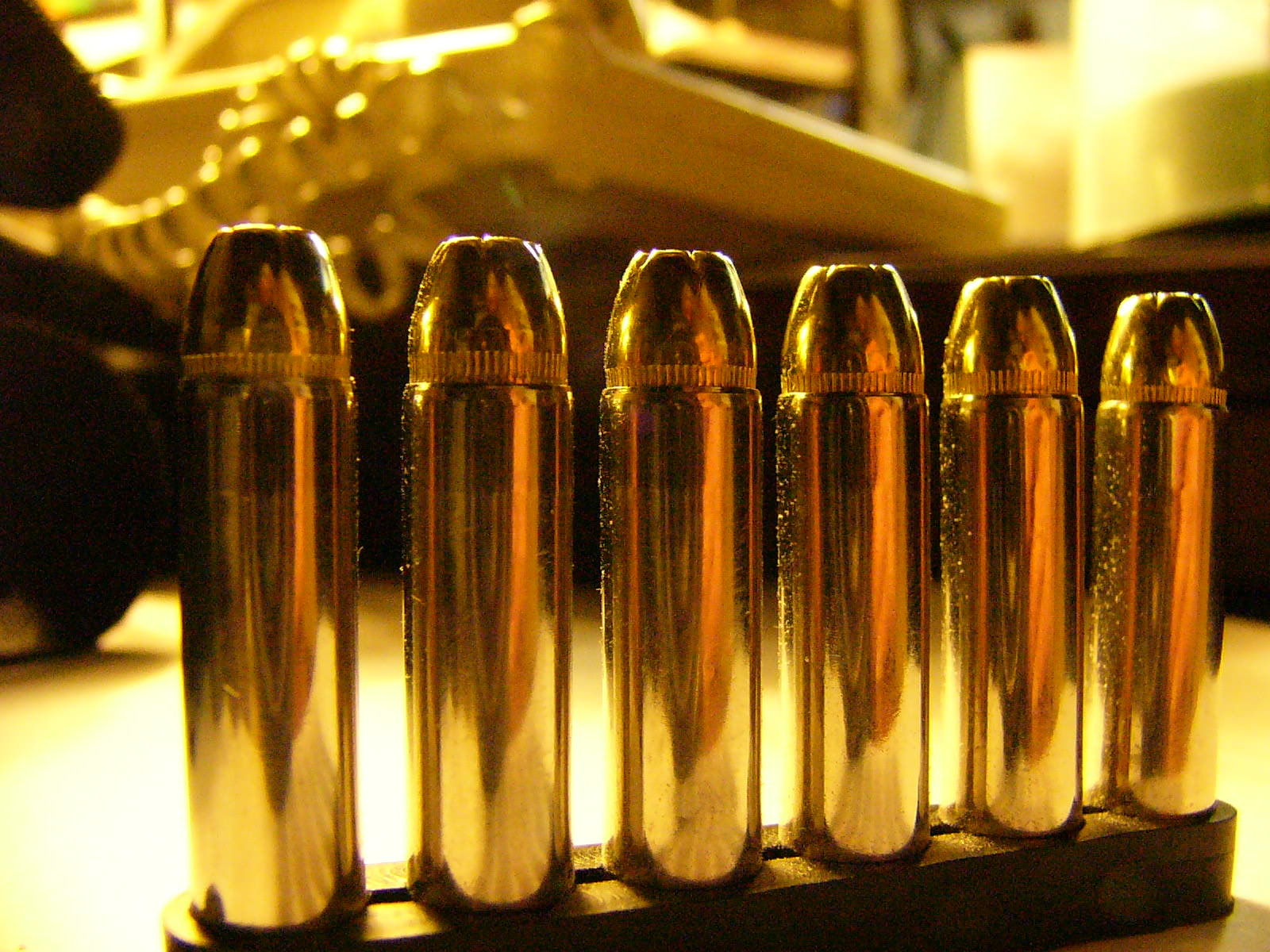 A speed strip of .357 Magnum 125 Montana Gold JHP, with pocket lint.