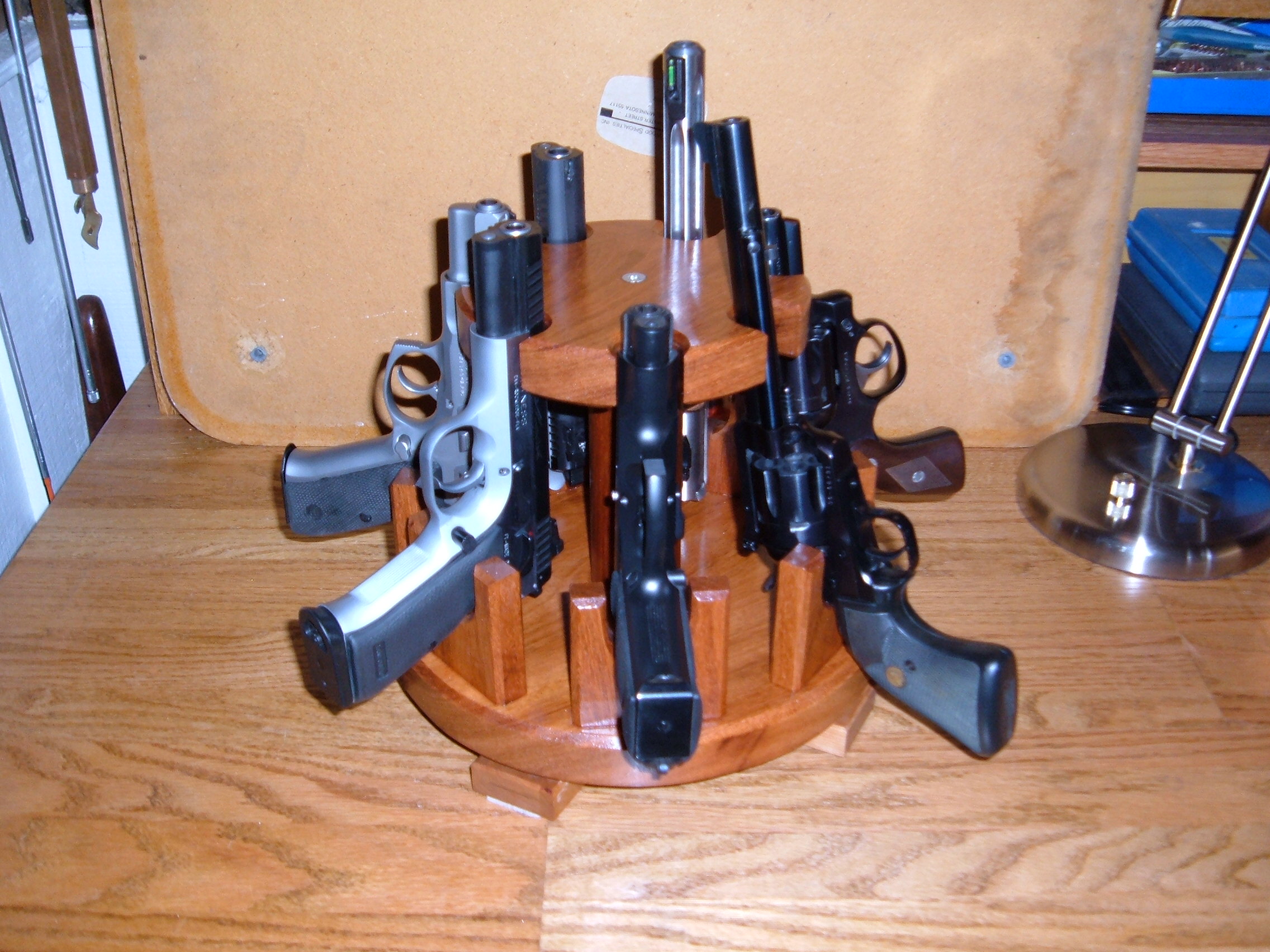 I do set a couple upside-down ... resting on the sights ... leaning slightly against the sides ... if ya took like a 12in x 24in ('er however wide yer safe is) 3/8 - 1/2in plywood, and then screwed 3 - 4in 1x2's so they're perpendicular ... 'bout every 2.5in 'er so ... ya could set the guns into each "slot", upside-down, with the grips resting against the 1x2's! I dunno if that'd let ya store any more than my current dowel method ... but if ya measured the overall width of each gun, and varied the "slot" widths, I'd guess ya might?!
