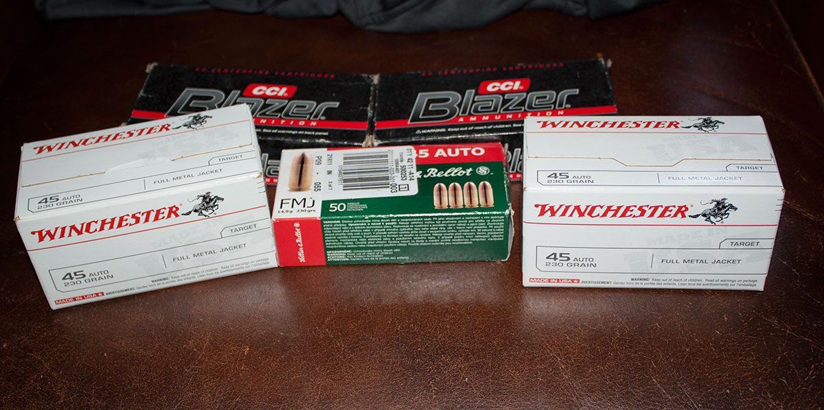 1) Winchester White Box: two boxes at 100 rounds each. FMJ, brass, 230 grain one box sealed, one opened but full. I opened one box to take a look at them after I bought them. It was my first box of WWB .45. 200 total rounds