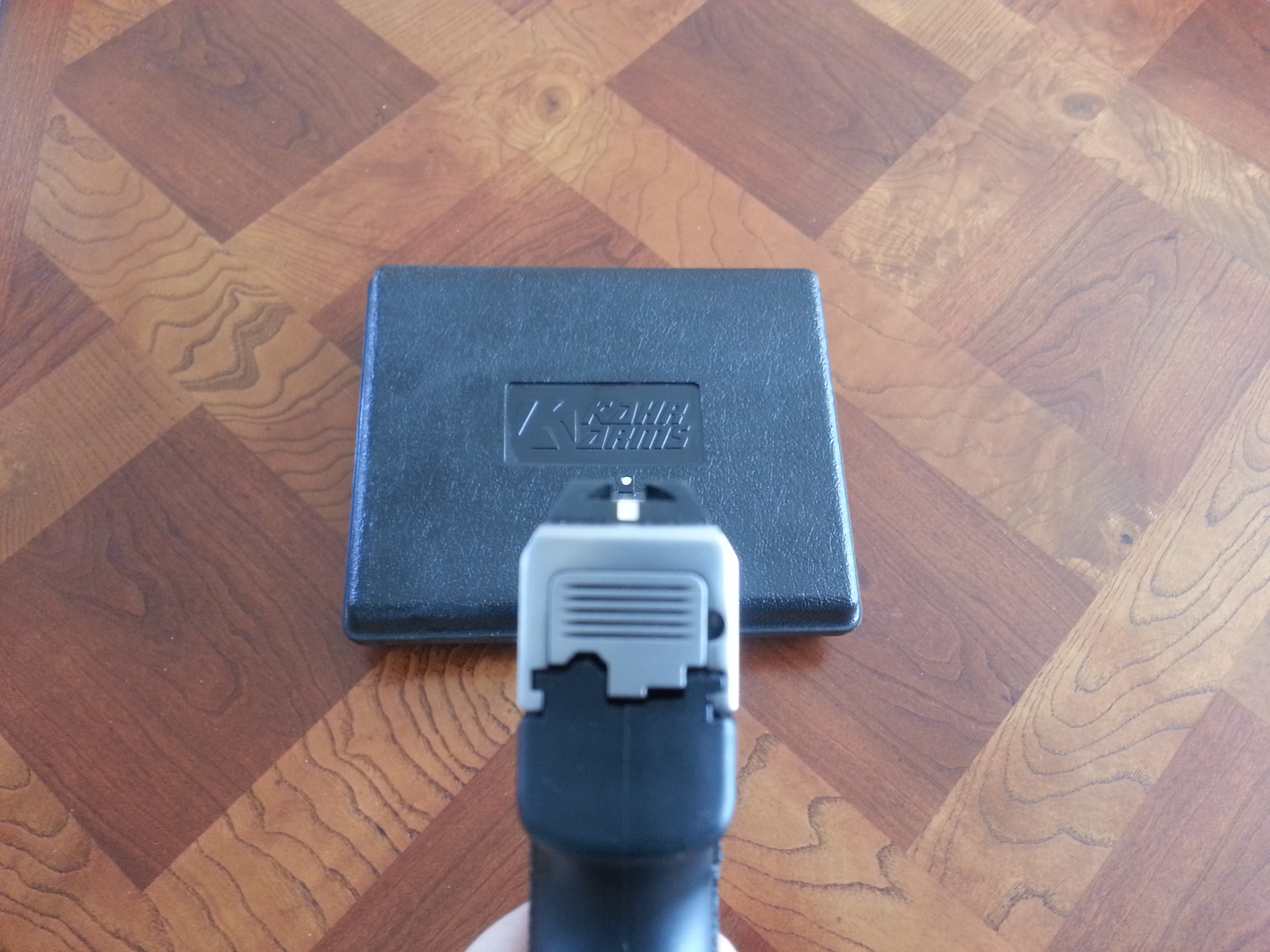 The Kahr basically looks like a smaller stainless Glock 26 knock-off with the squared off slide and polymer frame. The serrations on the slide and other 90 degree angles are very sharp, which shows the cost savings in manufacturing between this and the PM9. In the hand, the short grip will leave your pinky finger dangling, but you quickly get acquainted with the feel, and I never experienced any problems keeping a firm grip when firing. I may put a small piece of Talon grip around the base of the grip if humidity or sweat causes any problems. The safety seems well placed and easy to actuate as does the slide stop lever. The front sight is plastic fixed single dot, and the rear is steel straight bar adjustable for windage only.
