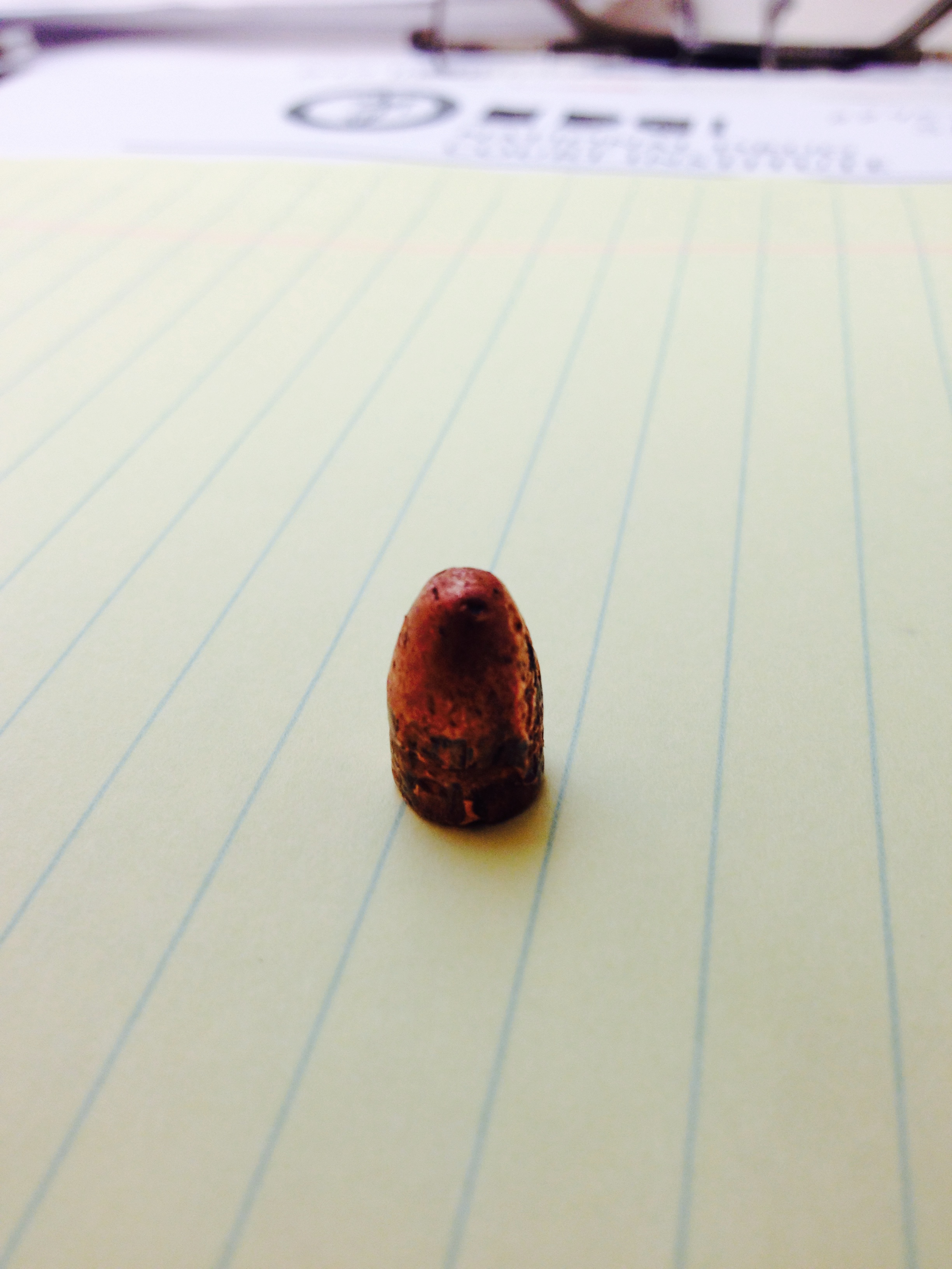 I have found on more than one occasion, a bullet either 9mm, .40 or .45 that has rifle grooves, but looks either perfectly fine, or slightly dented on the side, on the front or whatever... But in very good shape.