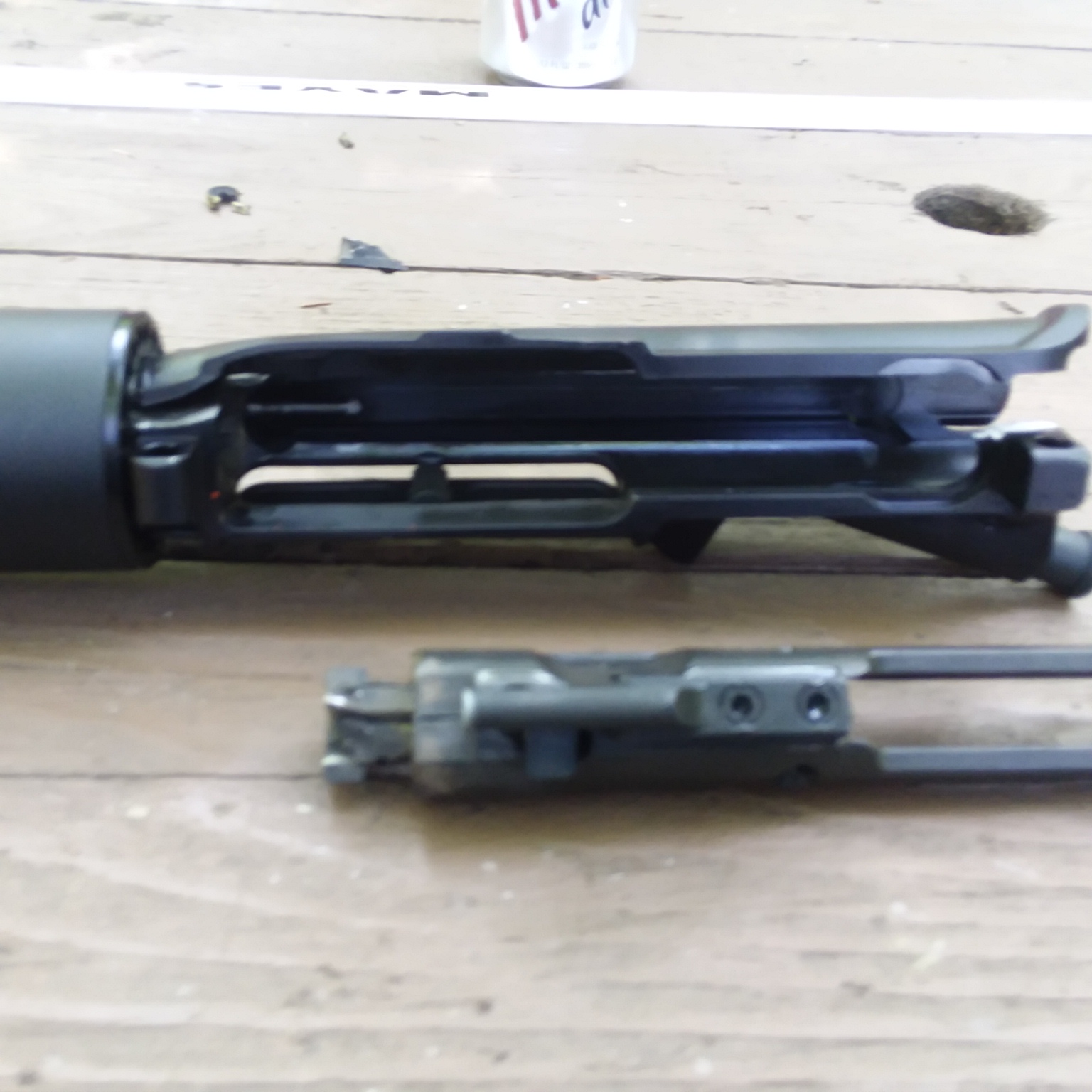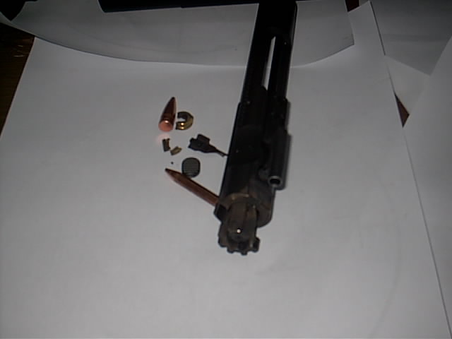 This is what happens when you have 2 AR15 rifles that look the same, but one is 5.56 and the other is 300 Black out, and you mix them up! Blew the mag out of the lower and shell out of the bottom of the mag. The bullet was about 1-1/2" from the muzzle, and I was able to push it out with a cleaning rod. The upper is junk, Bolt broken, bolt carrier splintered, upper receiver split open I don't know about the lower yet. Other than a small cut on my lower lip I am unhurt! It must have pushed the bullet back into the case, because the bolt closed with no problem.