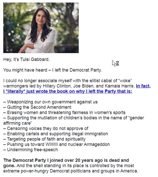 I've been following her on YouTube ever since she made the announcement that she was leaving the Democrat party. She could well be the only politician in existence today who actually has a conscience and believes what she says.