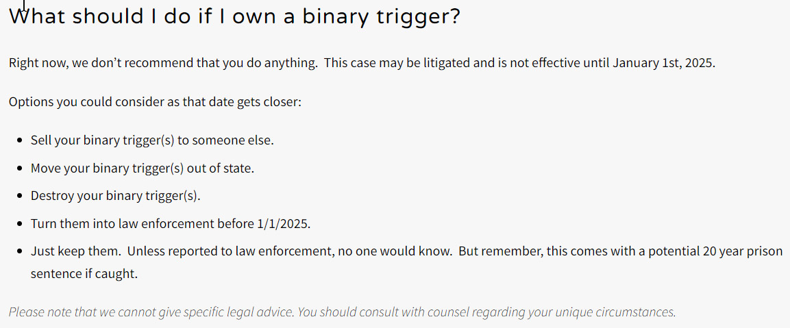 The law makes owning or possessing a binary trigger a felony, with a punishment of up to 20 years in prison or a fine of up to $35,000, or both.
